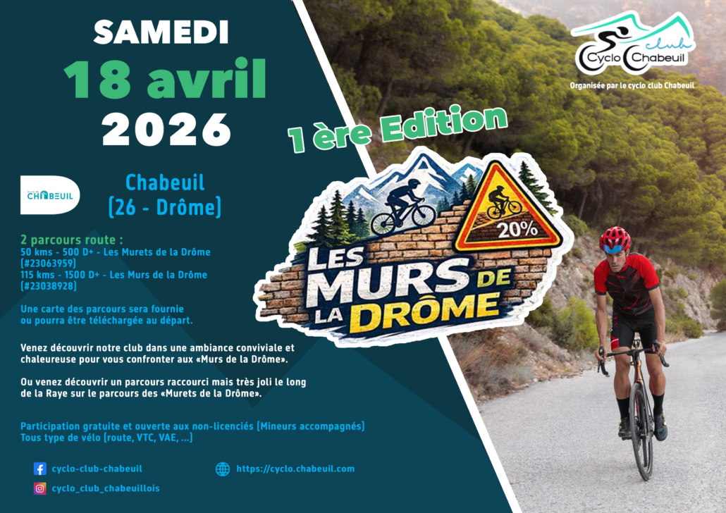 Nouvel événement organisé par le Cyclo Club Chabeuillois le samedi 18 avril entre 12h30 et 14h, le Cyclo Club Chabeuillois organise une randonnée route gratuite pour venir découvrir le club.